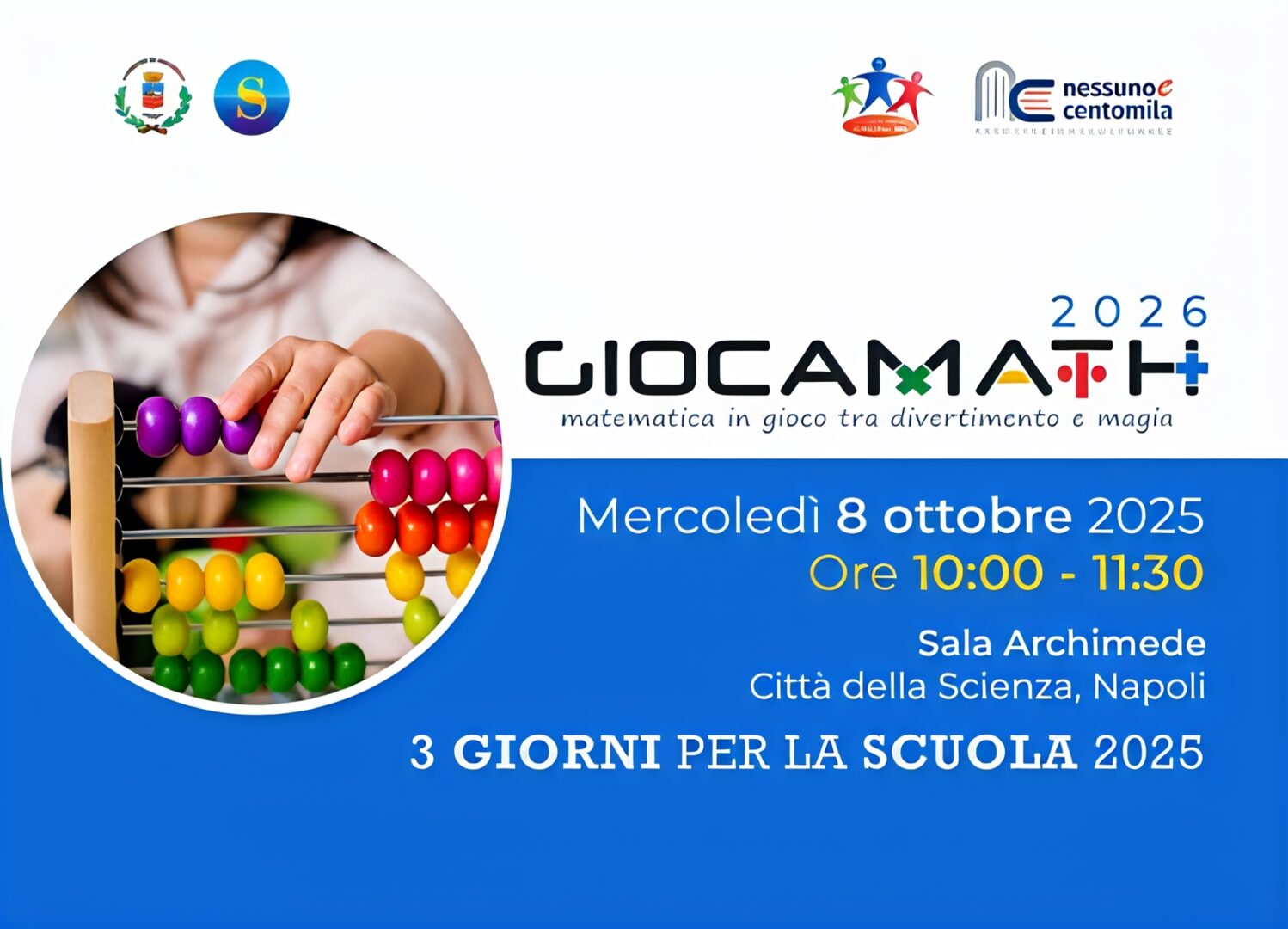Domani, 8 ottobre, nella Sala Archimede di Città della Scienza a Napoli, nell’ambito del programma “3 Giorni per la Scuola 2025”, sarà presentata la nuova edizione di GiocaMath – Gare di Matematica 2026, l’innovativo progetto di giochi matematici dedicato agli alunni delle classi quarte delle scuole primarie e agli studenti delle classi prime delle scuole secondarie di primo grado. L’iniziativa, fortemente voluta da Gaetana Falcone, Assessore alla Pubblica Istruzione del Comune di Salerno, è promossa e organizzata dall’associazione In.For.Dida APS in collaborazione con l’associazione culturale Nessuno e Centomila.