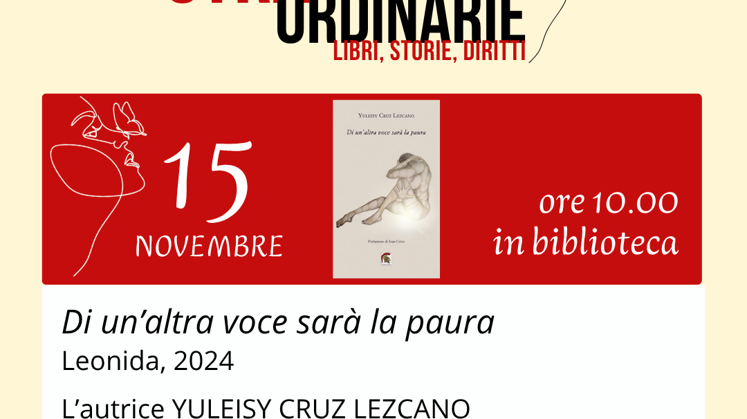 CERVIA – sabato 15 novembre 2025, alle ore 10:00, presso la Biblioteca Comunale “Maria Goia” (Via Circonvallazione Edoardo Sacchetti, 111 – 48015 Cervia, RA), si terrà la presentazione del libro Di un’altra voce sarà la paura, edito da Leonida Edizioni, della dottoressa Yuleisy Cruz Lezcano.