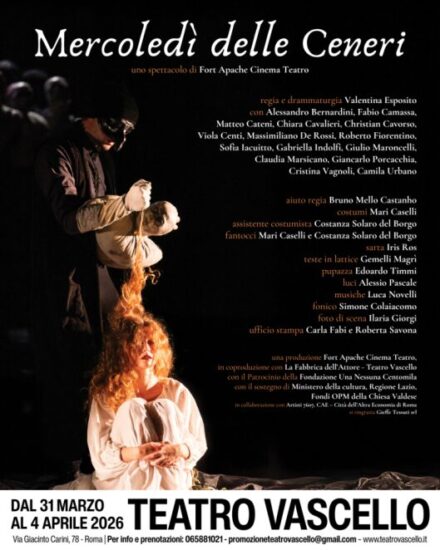 Al Teatro Vascello dal 31 marzo al 4 aprile dal martedì al venerdì h 21, sabato h 19 va in scena “Mercoledì delle Ceneri” scritto e diretto da Valentina Esposito con Alessandro Bernardini, Fabio Camassa, Matteo Cateni, Chiara Cavalieri, Christian Cavorso, Viola Centi, Massimiliano De Rossi, Roberto Fiorentino, Sofia Iacuitto, Gabriella Indolfi, Giulio Maroncelli, Claudia Marsicano, Giancarlo Porcacchia, Cristina Vagnoli, Camila Urbano