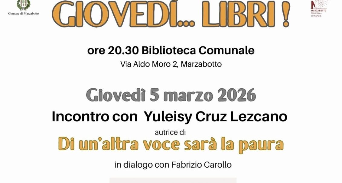 Presentazione del libro “Di un’altra voce sarà la paura” di Yuleisy Cruz Lezcano. Giovedì 5 marzo 2026Biblioteca Comunale di Marzabotto (BO). Marzabotto (BO) – Nell’ambito di DONNAFIERA 2026, giovedì 5 marzo alle ore 20:30, la poetessa e scrittrice Yuleisy Cruz Lezcano presenterà la sua ultima raccolta di poesie “Di un’altra voce sarà la paura” presso lo spazio Giovedì… libri! della Biblioteca Comunale di Marzabotto, in via Aldo Moro 2. L’incontro si svolgerà con il patrocinio del Comune di Marzabotto e sarà aperto al pubblico.