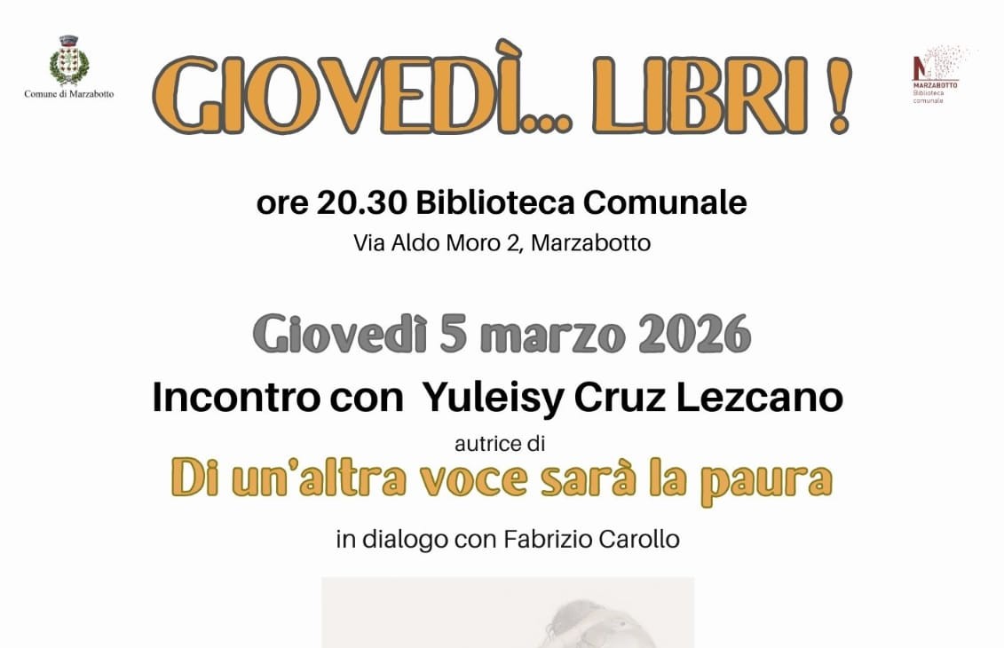 Presentazione del libro “Di un’altra voce sarà la paura” di Yuleisy Cruz Lezcano. Giovedì 5 marzo 2026Biblioteca Comunale di Marzabotto (BO). Marzabotto (BO) – Nell’ambito di DONNAFIERA 2026, giovedì 5 marzo alle ore 20:30, la poetessa e scrittrice Yuleisy Cruz Lezcano presenterà la sua ultima raccolta di poesie “Di un’altra voce sarà la paura” presso lo spazio Giovedì… libri! della Biblioteca Comunale di Marzabotto, in via Aldo Moro 2. L’incontro si svolgerà con il patrocinio del Comune di Marzabotto e sarà aperto al pubblico.