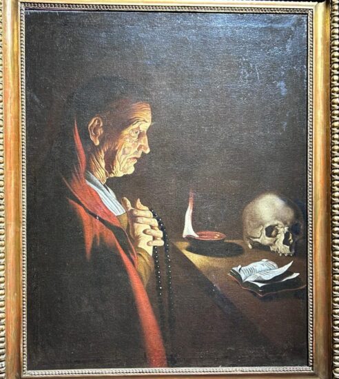 Il percorso espositivo prosegue con una sezione maggiormente dedicata a temi più drammatici della pittura caravaggesca: la violenza, il martirio e la morte. Caravaggio affrontò questi argomenti in opere celebri come “Giuditta che decapita Oloferne” e la “Decollazione del Battista“, trasformando il racconto biblico in una scena di forte impatto emotivo. Tra i vari artisti che raccolsero quest’eredità figurano Bartolomeo Mendozzi – autore dell’opera “Salomè con la testa del Battista” – e Massimo Stanzione, capace di fondere il realismo caravaggesco con una composizione più classica ed elegante.