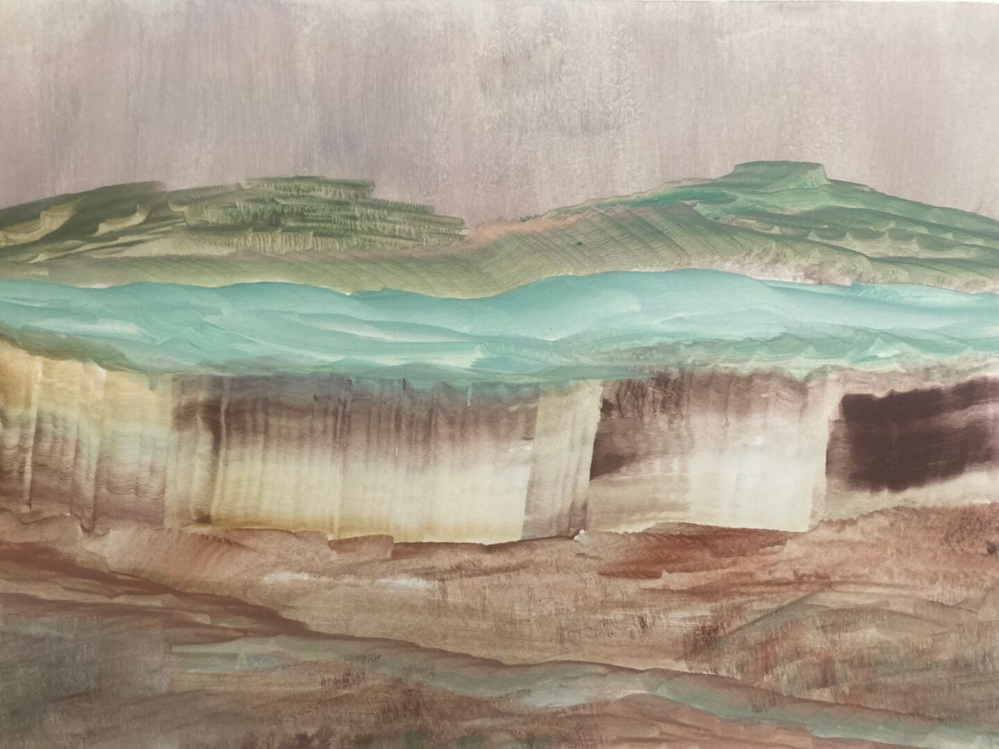 Alzando gli occhi, si nota un’altra opera, di piccole dimensioni, ma capace di evocare profondità celesti e, al contempo, abissali. È uno spazio circoscritto in una cornice ristretta, ma è enorme per la fluidità dei movimenti e l’orizzonte sconfinato che i colori riescono a proiettare nella mente di chi osserva. Gli occhi dell’osservatore e il paesaggio, che ricorda quello di un sogno passato, si fondono in questa esplosione di colori verdi-blu-porpora. I due interagiscono come d’incanto, esercitando una forma di intelligenza emotiva e collettiva: quella che il quadro (e la sua pittrice) nasconde in sé e quella del suo fruitore.