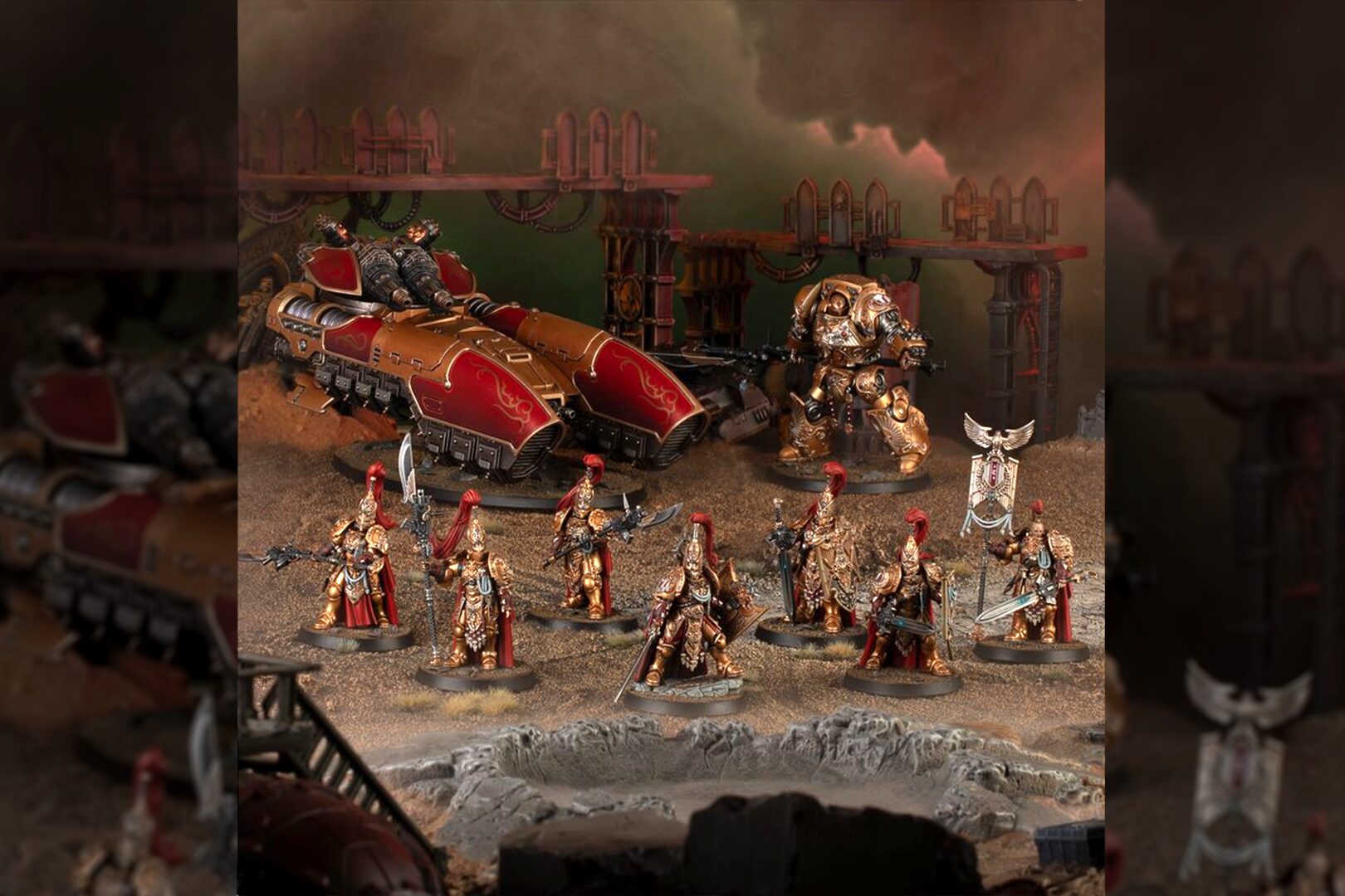 In alto, la Dreadnough e alcuni Custodes, in basso il Caladus Grav-Tank. Fonte: Locandina Legio Custodes Battle Group, Games Workshop.