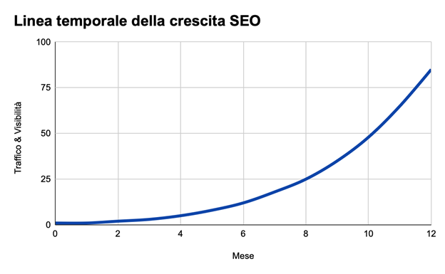 - Crescita solida (dopo 6-12 mesi): se la strategia è stata eseguita correttamente, dopo il sesto mese i risultati diventano solidi e la crescita costante. Il posizionamento per le parole chiave principali si consolida, il traffico aumenta in modo significativo e il ritorno sull’investimento (ROI) diventa chiaramente visibile sotto forma di contatti, vendite o lead.
