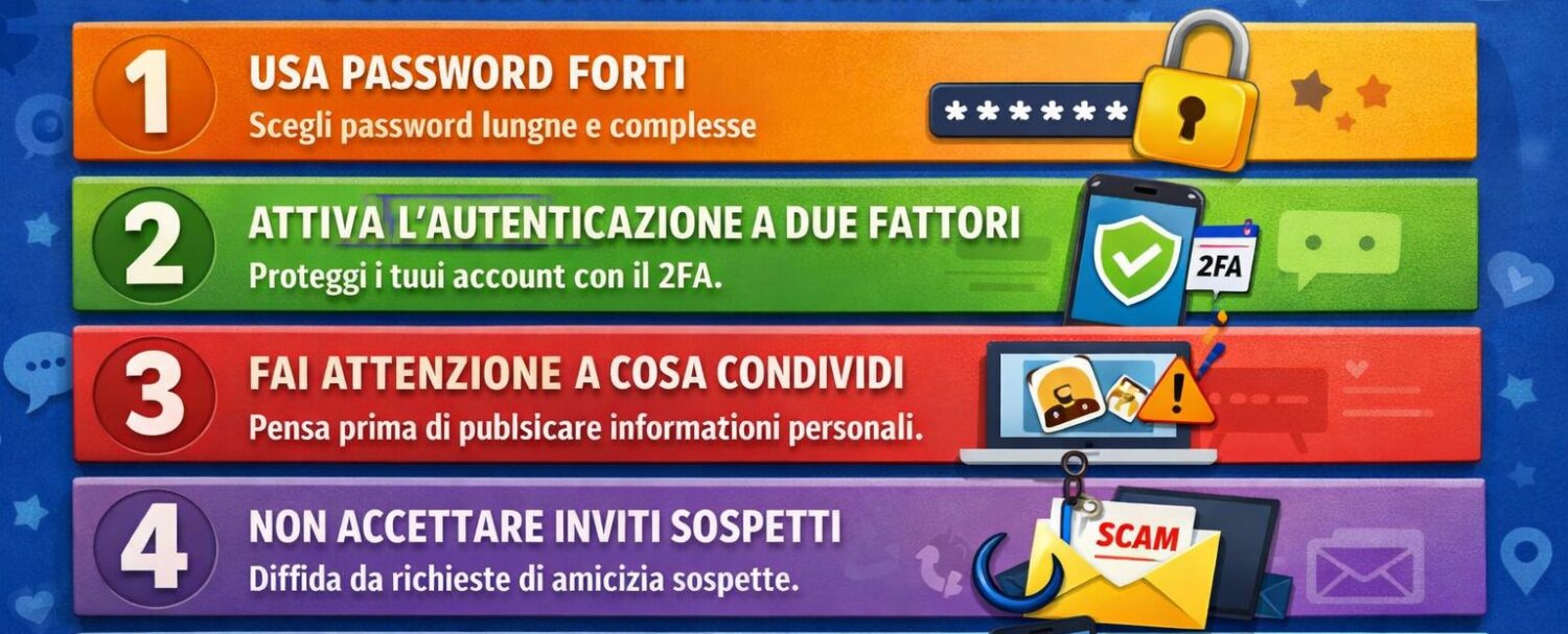 Un accorgimento semplice è disattivare la geolocalizzazione nelle foto e nei post, così da non mostrare la tua posizione esatta in ogni momento.