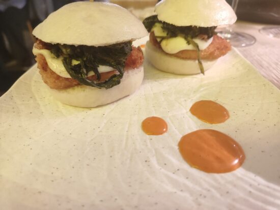 Continuando con un assaggio di un mini bao con baccalà impanato nel panko, fiordilatte e friarielli con un tocco extra di maionese sriracha, accompagnato da un Rosè pugliese San Marzano, Amai, susumaniello del Salento IGP.