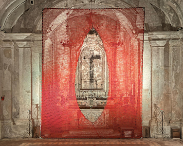 Il suo corpo agisce sotto il peso di un’imponente installazione in crochet: cinquemila metri di cotone pazientemente intrecciati  che incombono sull’altare maggiore trasformandolo in un luogo di attraversamento, un portale. Nelle cappelle laterali, è ancora il corpo dell’artista a riaffiorare, questa volta evocato in forme ambigue e liminali: il barlume di un feto, la traccia possibile di un cordone ombelicale, l’immagine del suo cranio trasfigurato in supporto plastico ad evocare l’antico culto delle anime pezzentelle.
