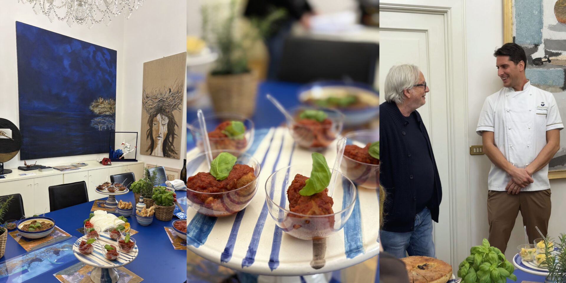Ad accogliere gli ospiti e i giornalisti invitati alla brand presentation di Mammèla — la cucina della Masardona, c’era una lunga tavolata disposta nel blu delle opere di Antonio Nocera, in un dialogo tra arte e gastronomia.