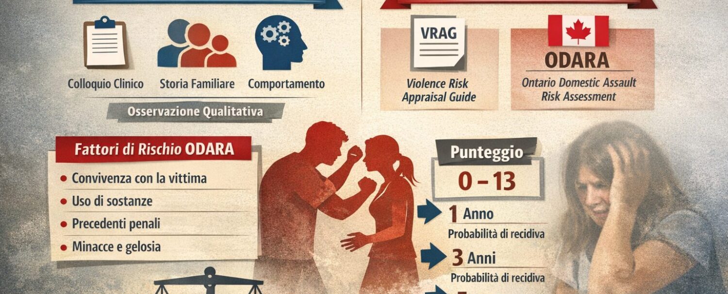 La valutazione del rischio di recidiva in ambito di violenza domestica rappresenta un pilastro fondamentale per la prevenzione secondaria e terziaria. Tra gli strumenti maggiormente utilizzati per la valutazione del rischio di recidiva e l’identificazione precoce di segnali di escalation, si distinguono una valutazione clinica strutturata, che è basata sull’osservazione professionale e sull’integrazione delle informazioni qualitative (colloqui clinici, storia personale, relazioni familiari, pattern di comportamento), e gli strumenti attuariali.