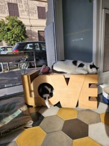 Il bistrot ospita una piccola famiglia di gatti, tutti adottati attraverso l’associazione Luna di Formaggio, che si prende cura di animali abbandonati.