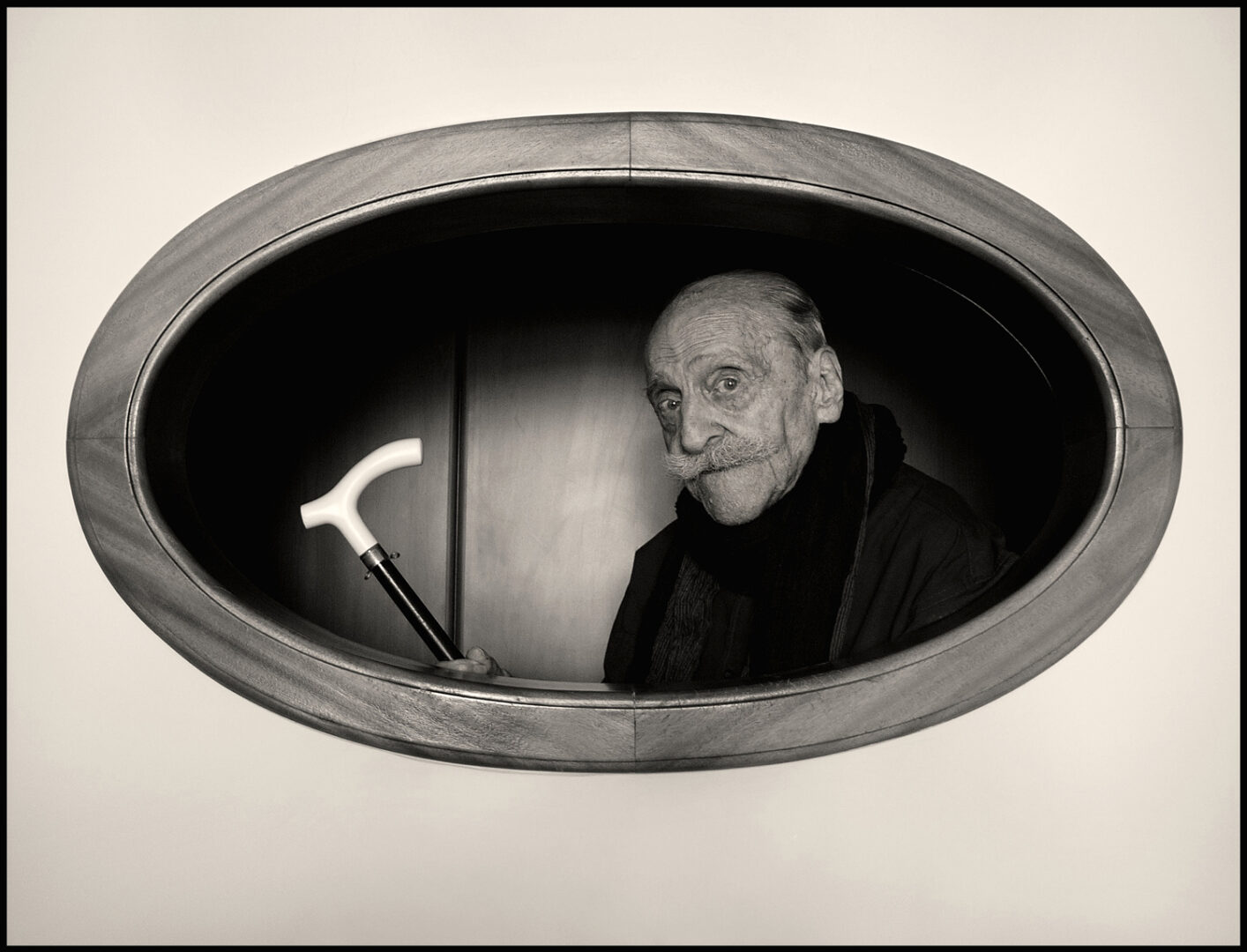 Questa è stata per me un’occasione straordinaria per apprezzarlo ed amarlo ancora di più e il ritratto che pubblico l’ho realizzato proprio in questo magico periodo, negli ultimi anni della sua vita. Ricordo che quel giorno lui era come sempre seduto sulla sua poltrona e mentre lo guardavo sentii di volerlo fotografare, fu una vera ispirazione ed io subito gli parlai del mio desiderio. Inizialmente non si mostrò molto contento ma poi dopo qualche insistenza, si lasciò convincere. Allora cominciai a girare per casa cercando un’inquadratura che potesse soddisfarmi, perché avevo qualche idea, ma non ancora ben delineata. Dopo poco focalizzai il mio interesse su di un oblo posto sulla parete tra il salone e uno dei corridoi, che avrebbe potuto incorniciare il ritratto, esaltandolo. Allora accompagnai mio padre dietro quell’oblo, lo feci salire su di un piccolo scanneto perché l’apertura sul muro era un po alta e chiaramente gli portai il suo inseparabile bastone, senza il quale è come se gli fosse mancato una parte del corpo. Lui senza che io gli dicessi niente si mise in posa guardando nell’obiettivo con uno sguardo sbarazzino che sembrava quello di un attore consumato, abituato da sempre a stare avanti alla cinepresa…io feci un solo scatto. Era stato incredibilmente bravo nel posare ed io non me lo aspettavo proprio. Quando dopo qualche giorno gli portai la foto stampata, lui mi guardò e disse: ” ma sembro un vecchio “. Aveva una novantina d’anni, ma si sentiva come un ragazzino. Sicuramente è stato l’uomo più importante che ho fotografato. Grazie di tutto papà, ti voglio bene.