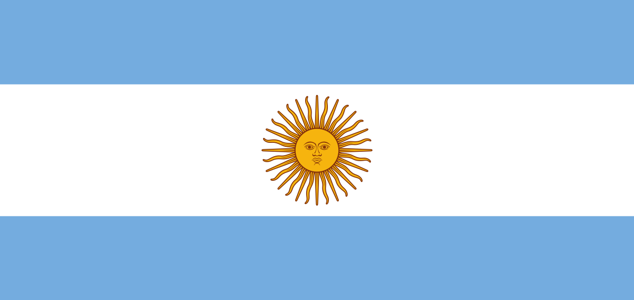 La bandiera dell’Argentina nasce nel 1812, grazie al generale, politico ed economista Manuel Belgrano, il cui padre, Domenico, era un commerciante d’olio di Imperia (in Italia) emigrato in Spagna e successivamente in Sud America. Si narra che guardando il cielo sul fiume Paraná, Belgrano fu talmente ispirato da creare un simbolo che ancora oggi rappresenta il sentimento argentino. È rappresentata da 3 bande: due azzurre esterne e una bianca al centro, proprio dove è presente il Sol de Mayo, simbolo di una divinità indigena (Dio del sole degli inca di nome Inti), difatti al suo interno è presente un volto e 32 raggi che rappresentano la prosperità. È un simbolo che rappresenta la libertà e indipendenza ma che esisteva già prima del 1812, difatti era presente su alcune delle antecedenti bandiere argentine.