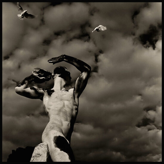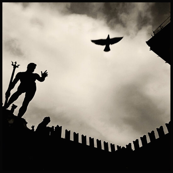 Mentre camminavo sulle sponde dell’Arno, mi accorsi che molte colombe si erano raggruppate sul muretto: allora inquadrai e aspettai. Feci molte istantanee, perché da quel gruppetto si alzavano in volo diversi pennuti ed io scattavo a raffica, per riuscire ad avere l’immagine giusta. Alla fine, con un po’ di fortuna e tanta pazienza, fui accontentato. La terza immagine è ambientata nella piazza del Nettuno a Bologna. Mi accorsi che molti piccioni transitavano da una parte all’altra dello spiazzo, così, anche stavolta, inquadrai la silhouette della statua e aspettai il momento opportuno, ma ci volle molto. Diversi passanti si giravano guardandomi con aria interrogativa, incuriositi perché ero fermo nello slargo, con l’occhio incollato al mirino, senza scattare e, insieme al Nettuno, sembravo essere anch’io un’altra scultura. Quell’attesa, però, fu proficua e, finalmente, una colomba, volando, si mise proprio sulla traiettoria del dito del dio del mare, che sembrava indicarlo. I giochi erano fatti e il risultato soddisfacente. Oggi, con l’aiuto del programma Photoshop avrei potuto tranquillamente “incollare” senza fatica quegli uccelli nell’immagine dove e come volevo, ma, in realtà, preferisco e preferirò sempre concludere l’atto creativo con un solo click.