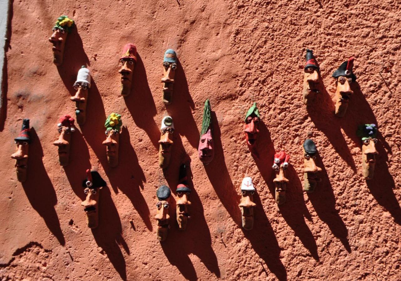 Sono maschere in terracotta minuziosamente fatte a mano e ogni pezzo è unico: raccontano una storia e tramandano credenze popolari di generazione in generazione. Le maschere dal naso lungo e occhi grandi riportano all’elfo delle leggende nordiche e pur avendo un aspetto scherzoso, sono simbolo di protezione e prosperità per chi li invoca o per i poveri. Sono associati agli spiriti domestici, per questo si predilige averli nelle abitazioni. Il naso lungo riporta alla fertilità e gli occhi grandi e espressivi servono a catturare le energie negative o a tenere a bada l’invidia altrui.