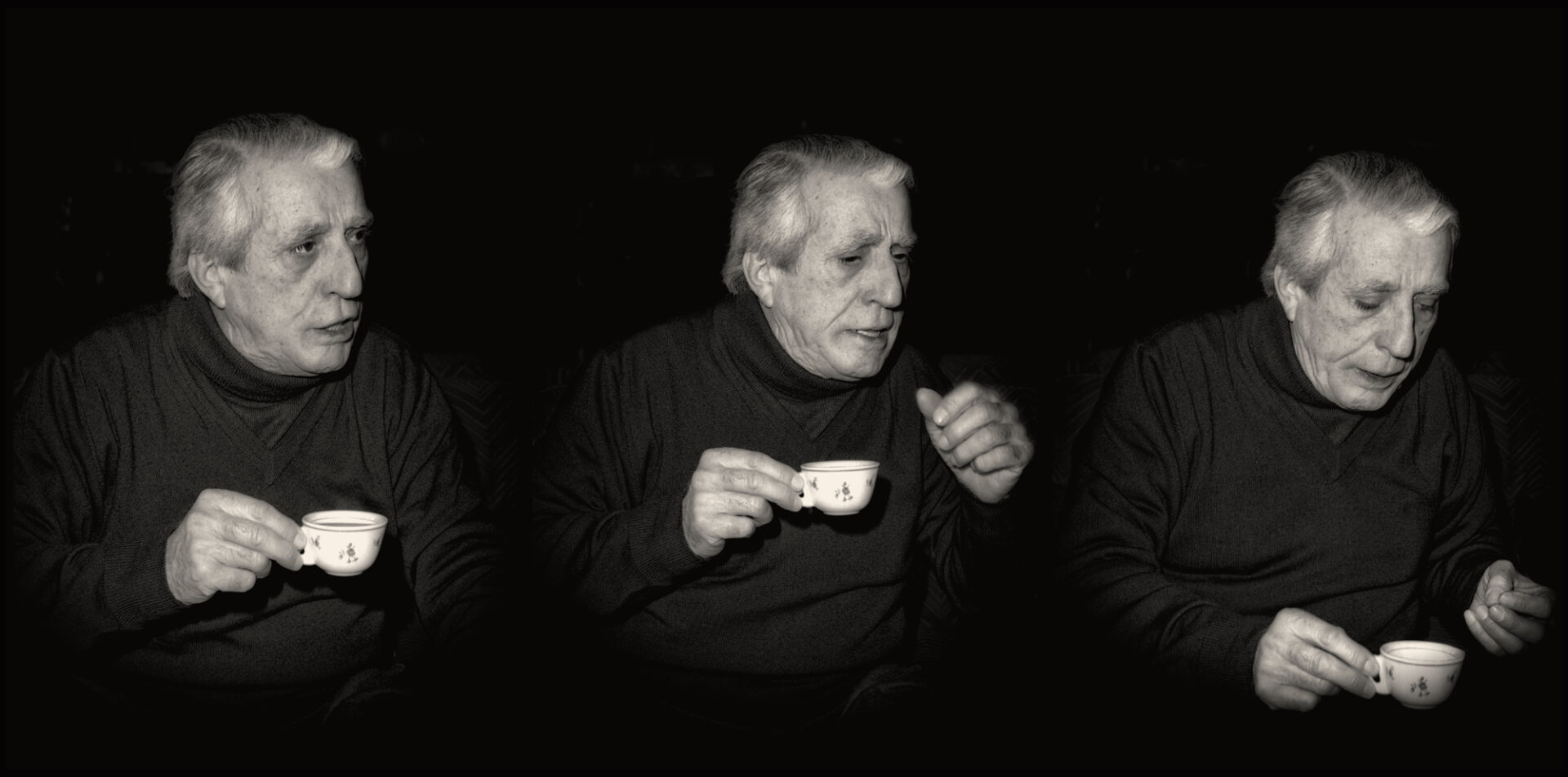 Io, pur emozionandomi molto mentre Bruni narrava la sua vita, continuavo a scattare con la mia fotocamera. Feci molte foto; erano immagini che lo riprendevano mentre gesticolava parlando, io, invece, volevo fargli un ritratto ed avevo già in mente come realizzarlo: desideravo fotografarlo mentre cantava. Gli chiesi di alzarsi e di attaccare con un suo brano, guardando fisso nell’obiettivo della mia Hasselblad. Non si fece pregare, mi accontentò subito e, come se stesse sul palcoscenico di un teatro, con estrema disinvoltura, cominciò ad intonare quello che era stato da sempre il suo cavallo di battaglia, ‘Carmela’, interpretandolo con grande maestria. Sergio Bruni cantava per me, chi l’avrebbe mai detto! Scattai per tutta la durata della canzone che il talentuoso Artista eseguì a cappella per intero. Poi, sempre molto serio in volto, ci salutò e si mise a sedere al suo solito posto. Dopo aver acceso l’ennesima sigaretta, cominciò ad ammirare nuovamente, con occhi sognanti, quella straordinaria veduta di Napoli che aveva di fronte. Di quell’incontro mi rimane soprattutto il ricordo di un uomo che amava follemente la sua città.