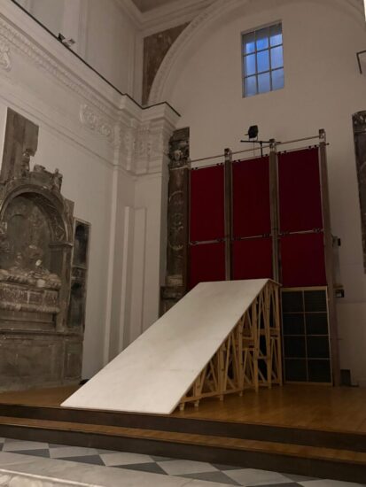 14.610 di Claudia Catarzi è andato in scena l’8 aprile alle 19 e alle 20.30 presso la Fondazione Il Canto di Virgilio a Napoli per la stagione di Körper. Ad accogliere il pubblico ci pensa infatti la splendida cornice della Domus Ars, residenza artistica e centro culturale della Fondazione sin dal 2010. La danzatrice e coreografa è già in scena quando il pubblico fa il suo ingresso ed il suo corpo raccolto in posizione fetale giace sulla sommità di una struttura lignea di quasi tre metri d’altezza. La performance è essenziale, quasi austera – qualità che le permettono di entrare in risonanza con la severa presenza imposta dalla vicina Chiesa di Santa Chiara, collocata proprio di fronte alla barocca, ma un tempo gotica, ex-Chiesa di San Francesco delle Monache, spazio riplasmato secondo il gusto sei e settecentesco ben espresso nella ricchezza dei pavimenti marmorei.