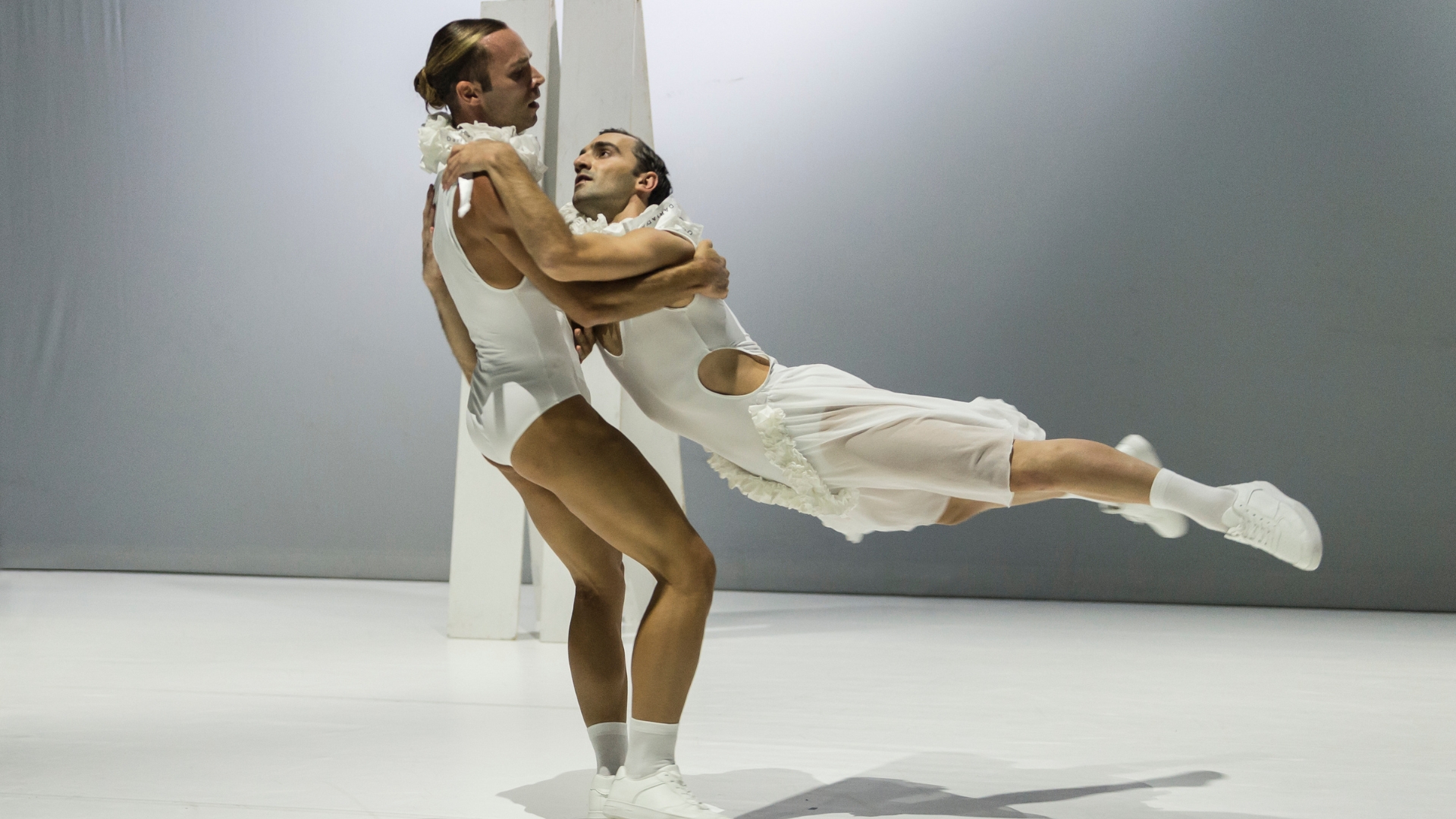Su tessiture sonore telluriche fanno il loro ingresso tre danzatori, Nicolas Grimaldi Capitello, Leopoldo Guadagno e Eleonora Greco. Corpi vestiti di bianco, avvolti in costumi ideati da Daria D’Ambrosio e caratterizzati da trasparenze e volumi studiati per esaltare e amplificare i movimenti.