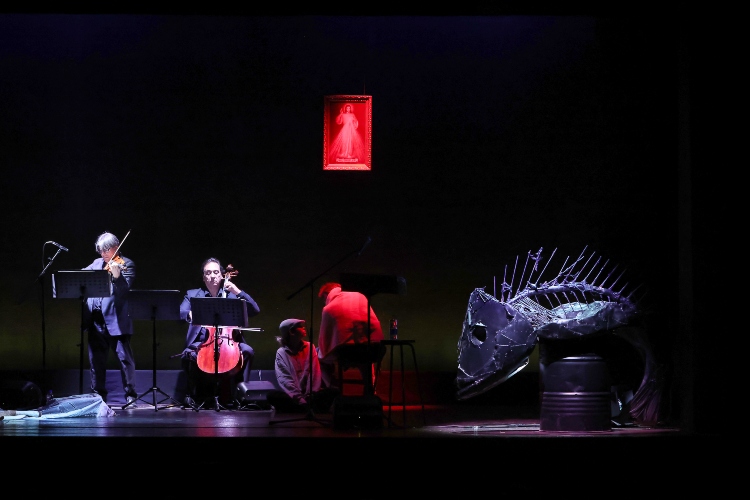 Una scenografia scarna con, in primo piano, la scultura di un pescespada fatto a pezzi, di cui restano solo la testa e la coda e nel mezzo una lisca spoglia. Sul fondo un quadro con un’icona sacra, una sedia su cui il vecchio Santiago siede di spalle con una coperta logora addosso e, di lato, sul palcoscenico, Manolin disteso a terra.