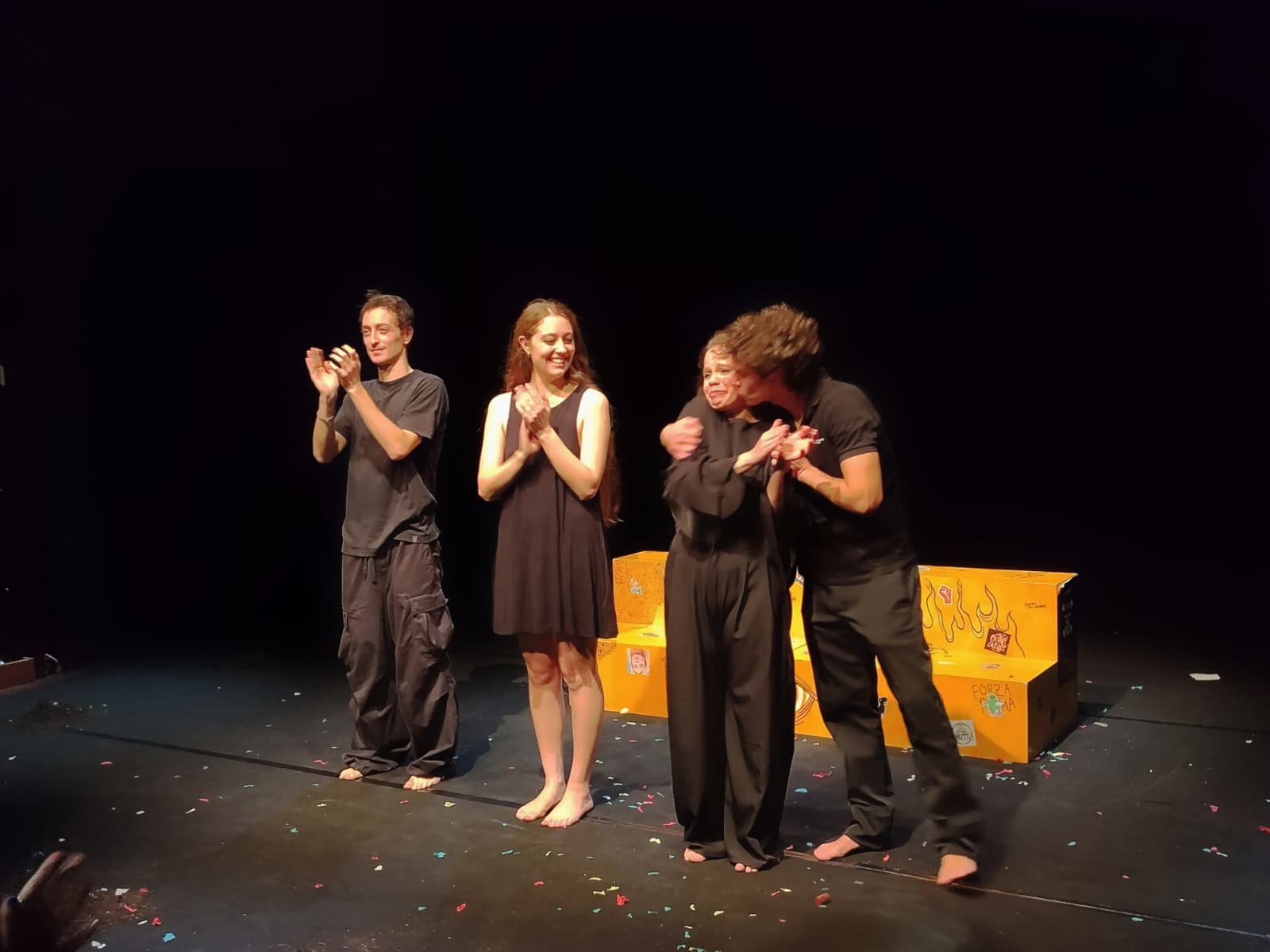 Lo spettacolo non si nasconde, non ha paura di essere scomodo o volgare, l’unico intento (ben riuscito) è quello di risultare spudoratamente veritiero nel raccontare le complicate relazioni interpersonali che ognuno di noi vive quotidianamente. Segreti, pregiudizi, debolezze, sensi di colpa ed etichette sociali vengono coraggiosamente smascherate e messe in piazza senza troppi fronzoli. Tra un salto temporale e l’altro, tra una festa, le discussioni e la decisione sul come comportarsi per il funerale di Milo, si arriva fra risate e lacrime alla presa di coscienza finale, che riunisce Emma, Flavio, Nadia e Jacopo nella condivisione del dolore, fra “Un’emozione da poco” che riesce, “A mano a mano”, a venire affrontata più facilmente con l’aiuto reciproco.